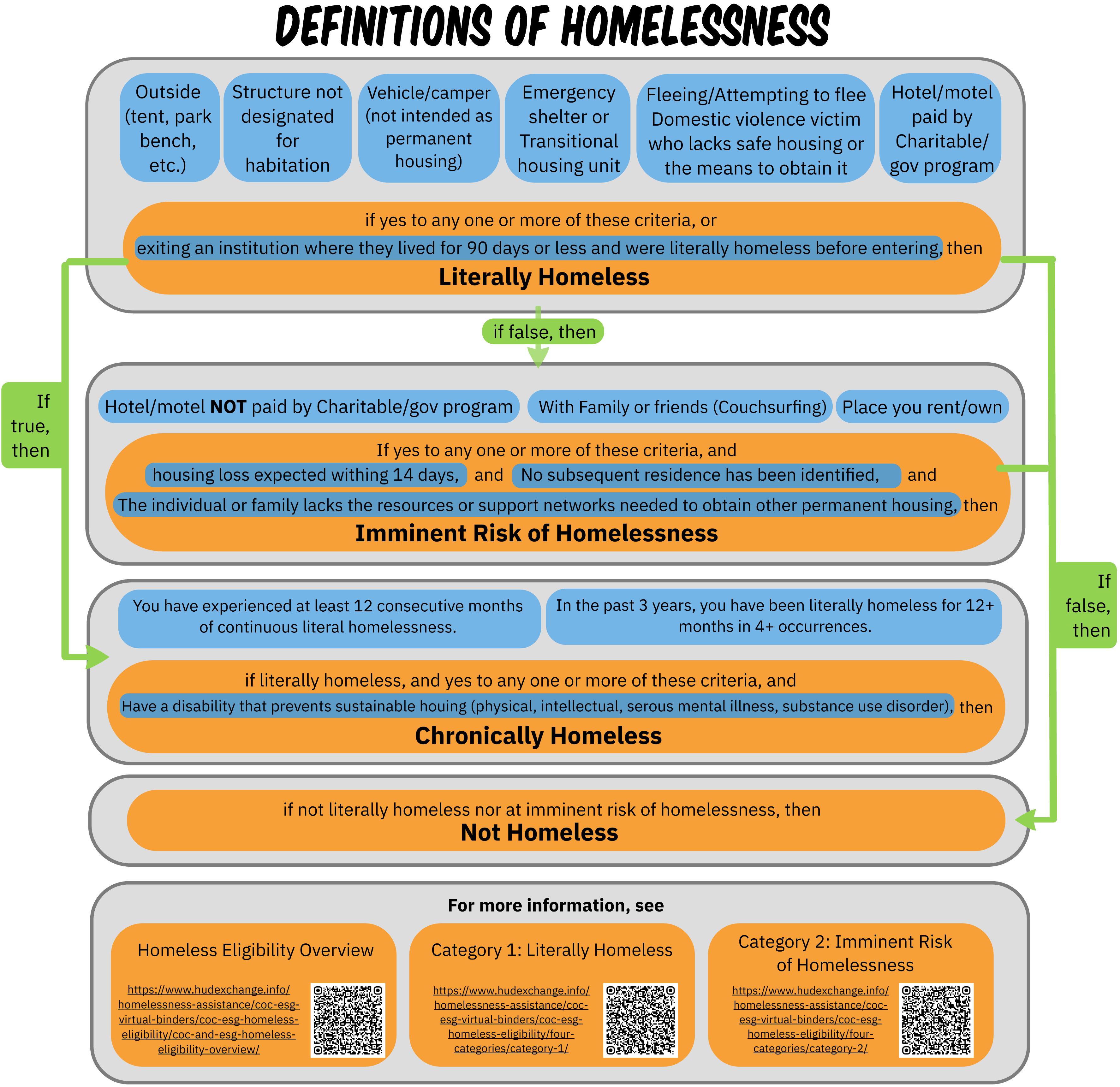 Let's start with a client's housing status. How can we know if a client is homeless? How simple is it to define housing status? For example, is living in an RV a homeless situation? Well, the answer is “it depends on additional criteria.” So, as you can see, it’s worth practicing. With the tools presented in this section, you’ll start to get a clear idea of how to define housing status.